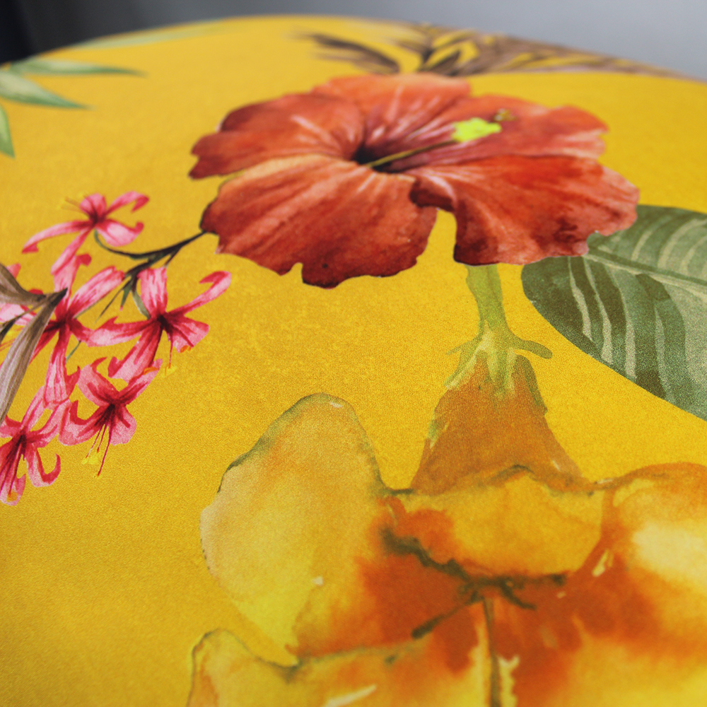 Geflecht aus tropische Blumen auf safrangelbem Hintergrund….