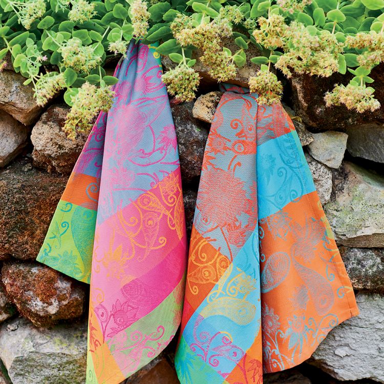 Eine Reise ins Herz Indiens in Form einer leichten und zeitgenössischen Komposition. In den Vogesen gedruckte Garnitur auf einem in den Vogesen gewebten Perkal. |